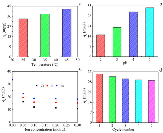 Figure 4 shows the influences of temperature, pH value, and electrolyte on its adsorption performance. Pb(II) adsorbing capacity was enhanced with temperature rising from 25 to 45 °C (Figure 4a), indicating an endothermic adsorption process. Meanwhile, Pb(II) adsorption was also promoted with pH increasing from 2.0 to 5.0 (Figure 4b), which was in agreement with the adsorption mechanism of metal–amine complexation. At lower pH level, the amine groups was protonated, and therefore the charge repulsion between MNPs and Pb(II) ions became more intensive, leading to the restraint of Pb(II) sorption. Besides, Pb(II) adsorption was restrained with addition of various electrolytes (Figure 4c), presumably due to their competitive sorption of cations. Divalent cation exhibited stronger complexing ability with amine groups, and therefore Ca2+ imposed a more remarkable inhibiting effect on Pb(II) sorption.