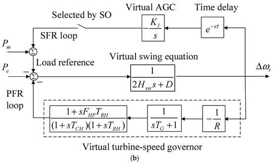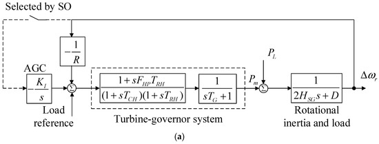 By the exploitation of conventional theories of the SG-based power system, the VSG algorithm also enables the PEIs to perform SFR and TFR. The SFR kicks in when the frequency deviation lasts for a preset time period after the frequency is stabilized by the IR and PFR. The TFR is activated by the system operator (SO) to set the load reference for each generation unit. For traditional SGs, the SFR and TFR are executed by the regulation of load reference settings, which is shown in Figure 1a. The variables of load references also pass through the blocks of the turbine-governor system. However, because only specific units in the power system are selected to perform automatic generation control (AGC) regulation, when the emulation of AGC is implemented on VSG-PEIs, the load reference can be directly fed into the block of the virtual swing equation, as shown in Figure 1b. In Figure 1b, is the time delay of SFR, KI is the coefficients of the integral controller.