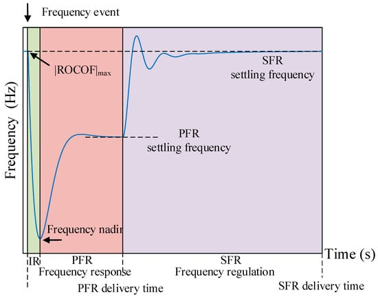 The system frequency indicates the overall power balance between the generation and the demand at any instantaneous time. In the traditional SG-dominated power system, active power-frequency control is a series of multiple temporal processes that can be divided into four stages []. As the VSG algorithm can fully emulate the frequency control performance of the SGs, the multiple temporal frequency control is also provided by the VSG-PEIs. For quantitative analysis, the performance indices mainly include the maximum ROCOF, the frequency nadir, the settling frequency, and the settling time, which are shown in Figure 2.