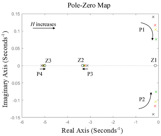 The pole-zero map of the transfer function is shown in Figure 4. From the transfer function G(s), the zeros are fixed on the real axis. With the increasing of H, the poles P3 and P4 tend to approach the zeros Z2 and Z3. As P3 and P4 are fast poles and very close to Z2 and Z3, the dynamic responses are mainly determined by the dominant zeros Z1 and the slow poles P1 and P2 []. It is noted that the inertia constants of different SGs, which are shown in Table 2, are in a small range rather than accurately the same []. The concept of VSG is to enable the PEIs to provide approximately synchronous responses like traditional SGs. Moreover, fast poles influence the early part of the time history []. The frequency responses based on the transfer function of the original and simplified systems are shown in Figure 5, which shows the maximum error between the two dynamic systems is less than 10% frequency deviation. Therefore, the estimation by the dominant zeros and poles are practically acceptable.