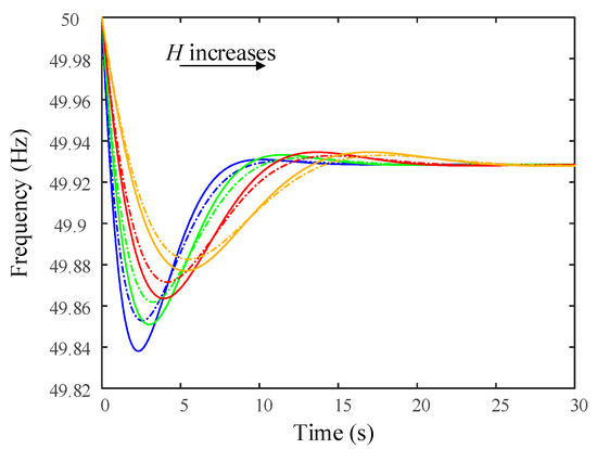 From Figure 6a,b,e, the increasing of inertia constant H leads to the decreasing of the magnitude of ROCOF, frequency nadir, and the overshoot. Therefore, it proves that inertia property could suppress the ROCOF and improve frequency nadir. From (c), the increasing of H also delays the peak time. However, the increasing H would slow down the dynamic responses, which is shown in (d). Therefore, there is a trade-off between the nadir improvement and the delivery time. From (f), the settling frequency is irrelative to H.
