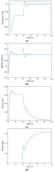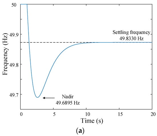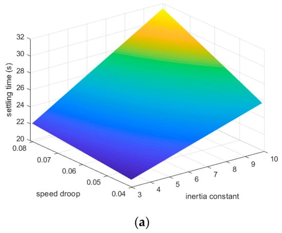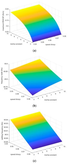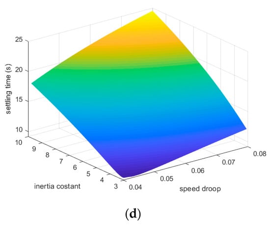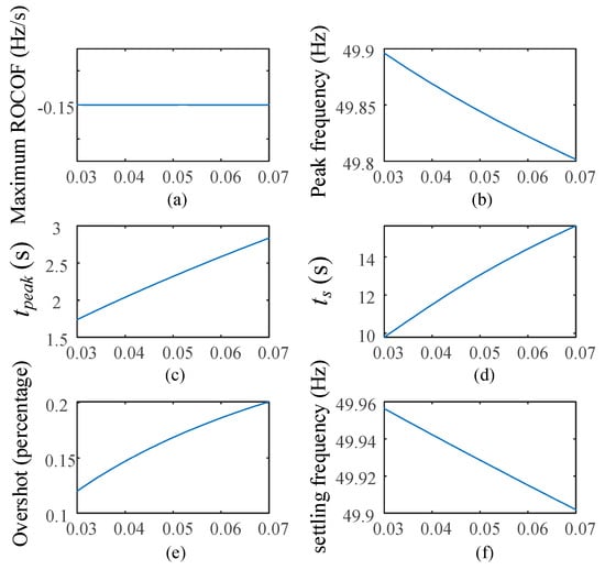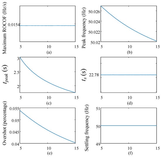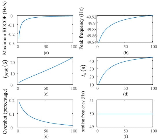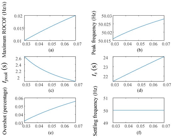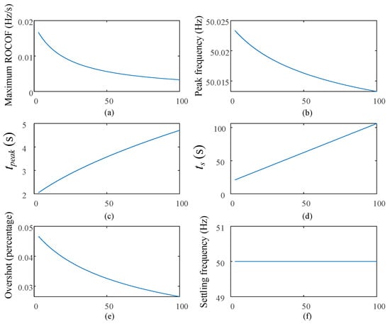 From Figure 10a,b,e, the increasing of inertia constant would decrease the magnitude of the ROCOF, the peak frequency, and the overshoot. However, from (c) and (d), the increase of inertia property would also increase the peak time and the settling time. From (f), the inertia constant is irrelative to the settling frequency.