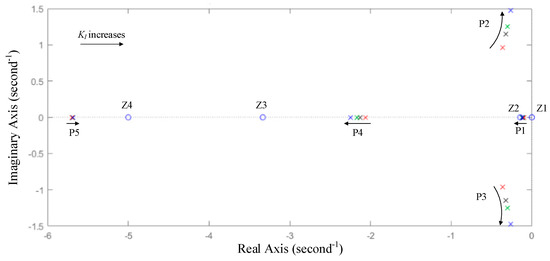 From the pole-zero map, the zeros are fixed on the real axis. With the increasing of KI, P1 tends to approach to Z2, which results in the mutual cancelation of effects. The effect of poles P4 and P5, and the zeros Z3 and Z4, which are far away from the imaginary axis, would be neglected for simplifications. Therefore, the poles P2 and P3, and the zero Z1 are dominant in the dynamic processes.