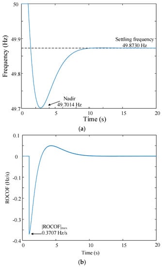 In Equation (27), when t = 0, ROCOF reaches the maximum value, which can be expressed as