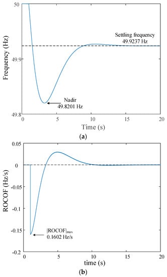 From Equation (25), system performance indices during SFR can be derived. First, the rate of change of frequency (ROCOF) can be expressed as