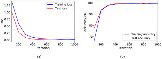 Quantitative results. Figure 4 shows the results obtained with the training and test sets: (a) the cross-entropy loss and (b) the classification accuracy of the CNN on the training and test sets. The loss and accuracy values are recorded every 100 iterations. The test accuracy of the CNN reached 100% after only 600 iterations (or updates) even though there was a slight performance degradation at 800 iterations. More importantly, there was no sign of overfitting since the training loss was always higher than the test loss, as shown in Figure 4a.