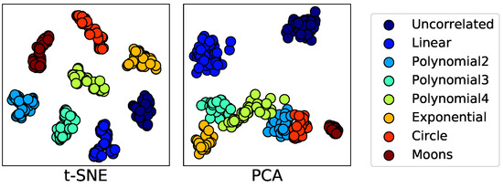 Qualitative results. Figure 5 shows visualizations of the dependence representations for the test set. The 1743-dimensional dependence representations learned with dependence type classifications are reduced into 2-dimensional vectors using t-stochastic neighbor embedding (t-SNE) [27] and principal component analysis (PCA) [28], which are visualized on the 2-dimensional space of each subfigure, respectively. In order for the classification of dependence types to be accurate, the learned results of dependence representations should be clustered. As shown in the figure, the representations are perfectly clustered by their dependency type. In particular, in the right subfigure of PCA visualization, ‘Polynomial3’ and ‘Polynomial4’ types of representations are positioned closely because they look actually similar, even though they are of different types. We interpret this figure as indicating that the dependence representations can not only capture similar dependence types, but also classify them with slight differences.