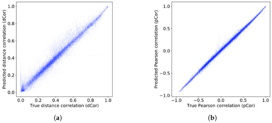 Scatter plot of the true correlations against the predicted correlation on the test set: (a) dCor regression results; (b) pCor regression results. Note that the subfigures (a,b) have different ranges.