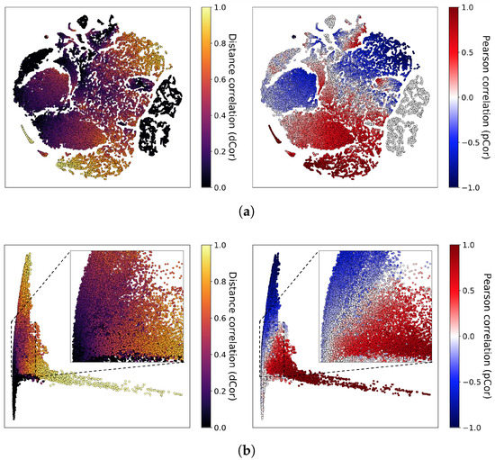 In each of the subfigures, the points to the left represent the true dCor value, and points to the right represent the true pCor value. Points that are close to gether have similar correlations. The independent feature pairs (dCor of zero) are clustered with themselves. The formation of coherent clusters of color as a whole indicates that the fundamental characteristics of given correlations have been well learned. Furthermore, the zoomed-in plots in Figure 7b show clusters of point that have a pCor of zero but a nonzero dCor.