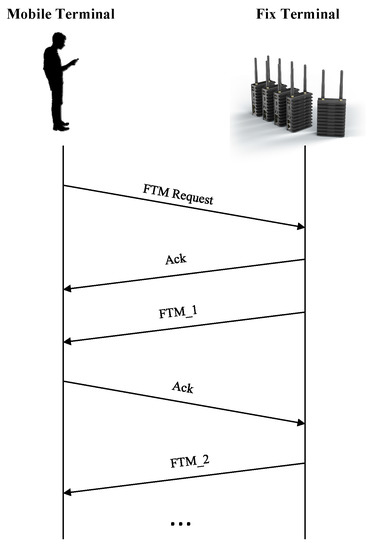 Here, TOF echo technology is used in the Wi-Fi FTM protocol and makes the RTT based ranging more convenient [18]. This new technology determines the distance according to the RTT of a Wi-Fi FTM pulse from an MT to an FT. Accordingly, it can eliminate the time synchronization errors in the time of arrival (TOA)/time difference of arrival (TDOA)-based ranging, with no need to synchronize the times of the FT and MT. The whole procedure of ranging is shown in Figure 1. It shows that a mobile phone is used as an MT to send an FTM request to FTs supporting the FTM protocol. After an FT receives the request, an Acknowledgement (ACK) signal is sent from the FT to the MT. After that, several FTM feedback signals are sent from the FT to the MT, where the mean RTT can then be calculated. The time information can be expressed as follows: