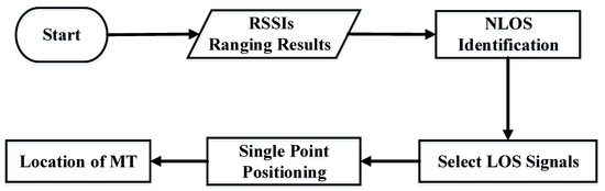 Flow chart of the proposed positioning method. RSSIs, received signal strength indicators; NLOS, non-line-of-sight; LOS, line-of-sight; MT, mobile terminal.