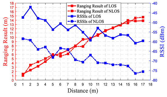 Ranging results and the received signal strength indicators (RSSIs) of line-of-sight (LOS/NLOS) signals.