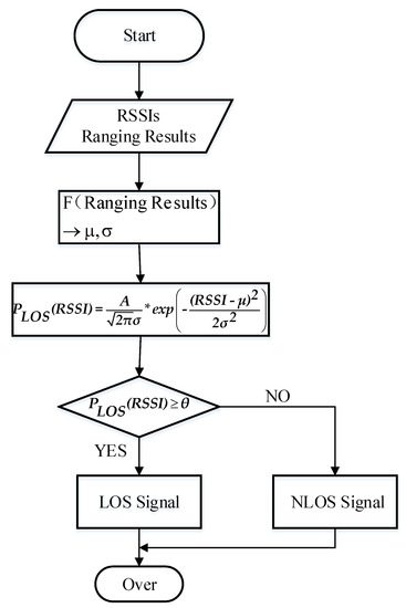 Most existing works [41,42,43] use a Gaussian distribution to model the randomness of RSSI, and consequently, in this paper, a Gaussian model was established to calculate the probability of LOS by Equation (5), as shown in Figure 4. The parameters of the model were determined by ranging results, and the inputs of the model were the RSSIs of the FTs. According to the maximum likelihood method, μ is the mean of the RSSI and σ is the variance of the RSSI in Equations (6) and (7), where is the RSSI collected at the distance d; N is the number of RSSI collected. The determination of and is described below in detail. After the parameters were determined, the probability could be determined by inputting the RSSI into the Gaussian model. Then, the probability was compared with the threshold . If the probability is greater than the threshold, the current signal is a LOS signal, and if it is less than, it is not.