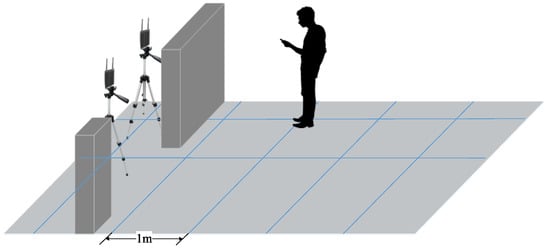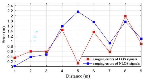In the paper, it was assumed that the ranging results could reflect the true distance to a certain extent. Therefore, we needed to evaluate the accuracy of the ranging results based on Wi-Fi RTT. As shown in Figure 5, a tester collected the ranging results of the FTs at each grid point. Here, the grid side length was 1 m, the sampling time was 30 s, and the sampling frequency was 5 Hz. The MT and FTs were basically at the same height during sampling. The ranging accuracy is shown in Figure 6. The red and blue solid lines are the ranging errors of the LOS signals and NLOS signals, respectively. Through calculation, the average ranging error of LOS signals was 0.87 m and the variance was 0.36 m. The average ranging error of the NLOS signals was 1.16 m and the variance was 0.54m. It can be seen that RTT-based ranging results can accurately reflect the true distance between the transceivers. At the same time, the ranging accuracy and stability of the LOS signals were better than those of the NLOS signals.