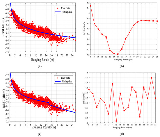 is the mean of RSSIs collected when the distance between an MT and FT is determined. According to the propagation model of electromagnetic waves, in Equation (5), the true distance is exponential with RSSI, so the exponential model was used to fit the ranging results and RSSIs.
