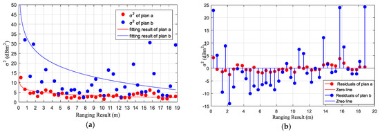 After the values were determined, the ranging results and values were fitted to generate a ranging result-based σ model. Figure 8 shows the fitting results of methods A and B. The red dot is the variance calculated by method A, while the blue point is the variance calculated by the other method. The fitting results and raw data are shown in Figure 8a, and the residuals of the two methods are shown in Figure 8b. It can be seen that variances calculated by method B fluctuate largely, which might be caused by over-fitting. In the range of 0–4 m, the variance of method B is higher than 15. Table 1 shows that the attenuation of RSSI caused by the reinforced concrete is about 15 dBm, so that when the variance is higher than 15, the output probability of LOS and NLOS is similar, which may make the set of threshold and identification difficult. Furthermore, as shown in Figure 8b, the fitting result of method A is better than method B, as the sum of square due to error (SSE) of method A is much smaller than that of method B. Hence, method A was used to calculate the variance used for the later fitting.