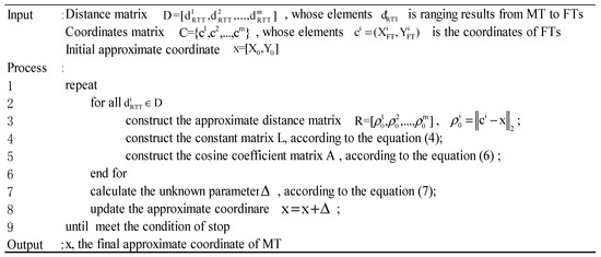 The pseudocode of single point positioning is shown in Figure 9. The observation equation was constructed using the inputs to calculate . Through iteration, gradually approached 0, where the approximate coordinate of MT was gradually steady. When was smaller than a threshold or the iteration number was more than a threshold, the iteration could meet the condition of stopping.