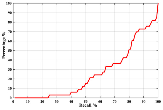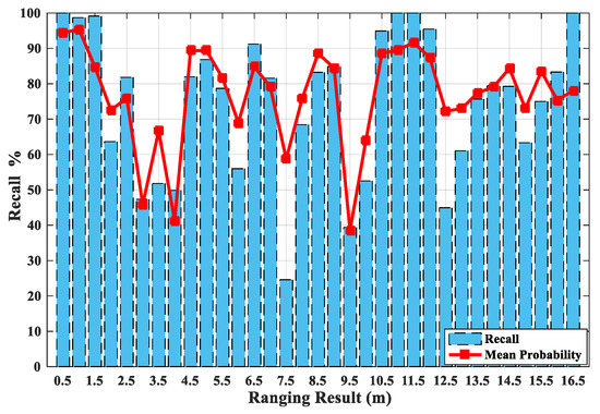 The recalls and mean probabilities at different ranges are shown in Figure 12, where the value of the blue column is roughly the same as that of the red line. It can be seen that the set of θ could distinguish LOS signals and NLOS signals. However, through calculation, the average recall was only 74.97% and the MSE was 0.2. Figure 13 shows the cumulative distribution of recalls. Here, 24.24% of the recalls were lower than 60%, and 51.52% of them were lower than 80%, indicating that the model often misjudges some LOS signals.