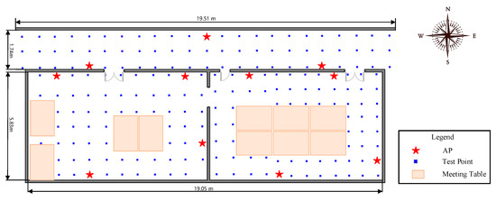 The experimental environment is shown in Figure 14, which includes two rooms and a corridor adjacent to each other. Both of the rooms were 19.05 m long and 5.83 m wide, while the corridor was 19.51 m long and 1.74 m wide. Totally, 10 FTs were positioned on a tripod with a height of 1.3 m. Among them, 8 were placed in two rooms on average, where 3 were positioned in the corridor, marked with a red five-pointed star. Here, 197 testing points were set, and marked with blue squares, with an interval of 1.2 m. The sampling time of each point was 30 s and the sampling frequency was 1 Hz. Two experiments were conducted to evaluate the proposed positioning method.