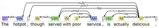 Another problem in previous research is that these methods largely ignore the syntactic structure of the sentence, while in fact the syntactic structure helps to identify the emotional characteristics directly related to the specific target. When a specific target term is separated from its affective phrase, it is difficult to find related affective words in its surrounding words. The CNN-based models perceive multi-word features as continuous words by convolution of word sequences, whereas it is not sufficient to determine the sentiment expressed by multiple words that are not adjacent to each other []. Take the following sentence as an example: “The hotpot, though served with poor service, is actually delicious”. As “delicious” and the target word “hotpot” in the word sequence are a little farther away from each other, the CNN models cannot capture the remote word dependency. On the other hand, in the syntactic dependency tree, the word “delicious” is closer to the target “hotpot” (see Figure 1). In addition, the use of syntactic dependency trees also helps to solve the potential ambiguity in word sequences []. In the simple sentence “nice beef terrible juice”, nice and terrible can be used interchangeably. It is difficult to distinguish which word “nice” or "terrible" is related to the target word “beef” or “juice” if only the traditional attention-based method is applied. However, if a person has a good knowledge of grammar, she can easily realize that “nice” is the adjective modifier of “beef”, and “terrible” is the modifier of “juice”. Since the structure of the syntactic dependency tree is similar to the graph structure and the graph convolutional network (GCN) [] is an effective convolutional neural network that is able to directly operate on graphs, this paper proposes an improved GCN to better extract and integrate the syntactic information displayed in the syntactic dependency tree of the sentences. Overall, semantic information and syntactic information are both crucial for determining the sentiment polarity of a specific target and this paper tries to embed the abundant semantic information and syntactic information into the word representation and specific aspect representation.