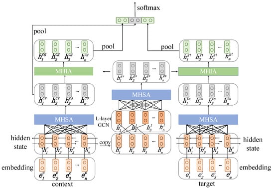 where “⊕” represents the vector concatenation, , is the output of the h-th head attention, and . Multi-head self-attention (MHSA) is a special situation of MHA whose input . Given the context hidden state and the target word hidden state , AEGCN can derive semantic encoding of the context and the target words , as follows: