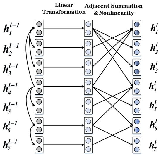 where is the linear transformation weight matrix, is the offset vector, and is a nonlinear function, such as . An example of a GCN layer is shown in Figure 3.