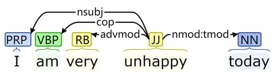 Next, after constructing the dependency tree of a given sentence, AEGCN first obtains the adjacency matrix according to the words in the sentence. Then, following the idea of self looping [], each word is manually set to be adjacent to itself—that is, the diagonal value of A is 1. The opposite direction of a dependency architecture is also included, which means and if there is an edge going from node i to node j; otherwise, and (see Figure 4 and Figure 5). Finally, the representation of each node is updated with a graph convolution [] with a normalization factor, as follows: