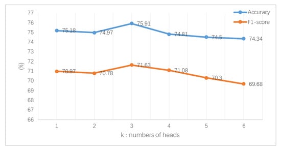 - The Number of Heads in MHAThis paper explores the influence of the number of heads k on the experimental results. The results over dataset lap14 are shown in Figure 6, and similar results were achieved on the other four datasets.