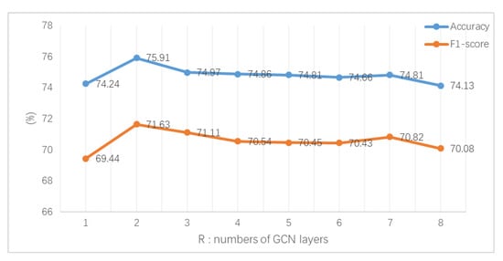 Figure 7. Impact of R over the lap14 dataset.From the above results, it can be seen that the model achieved the best performance when the number of GCN layers . However, when R was greater than 2, the performance of the model worsened with increasing GCN layers. The possible reason for this is that as the number of GCN layers R increases, the model parameters grow, causing the model to be more difficult to train, and leading to overfitting. In order to avoid too many training parameters and overfitting, this paper set the GCN layer number as 2.