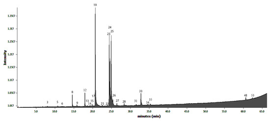 The samples in the SPME fiber were inserted in the port, with the purge valve off (splitless mode). Thus, in the first 5 min, the temperature was maintained at 50 °C. Later, the temperature was increased by 4 °C/min until reaching 98 °C. Next, three gradients at 4 °C/min were applied, until reaching 130 °C, 150 °C, and 230 °C, respectively. The time of the temperature process was equivalent to 50 min. The retention time, authentic standards and the Kováts Index (KI) allowed to identify each volatile compounds.