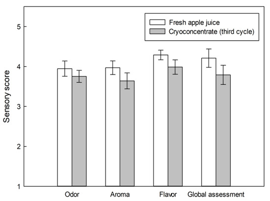 Figure 6 shows the sensory evaluation of fresh apple juice and reconstituted cryoconcentrate sample (3rd cycle). Results showed that cryoconcentration did not affect significantly (p ≥ 0.05) the odor, aroma, flavor, and global assessment of the reconstituted sample, in comparison to the fresh apple juice, although there is an apparent lower score for the cryoconcentrated samples. These results were similar to studies on cryoconcentration applied to black currant juice [55], since the cryoconcentrated juice was equivalent to the fresh sample for the same qualities analyzed in the present study. This advantage in the original characteristics preservation from the fresh sample has also been ratified by sensory evaluation on color, aroma, taste, and total quality of cryoconcentrated Andes berry pulp obtained by PCC [56].