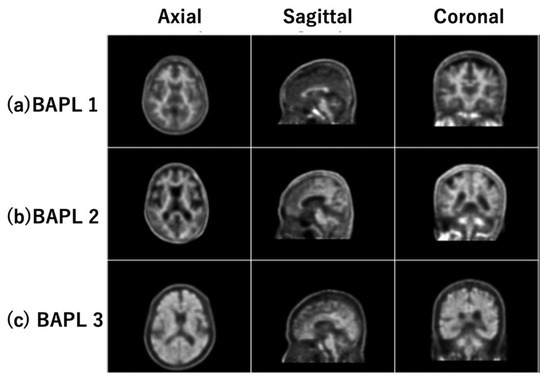 The PET images were categorized into three classes based on their BAPL scores: 1 (BAPL1), 2 (BAPL2) and 3 (BAPL3) [8]. The database comprised 380 PET images: 188 BAPL1 subjects, 48 BAPL2 subjects, and 144 BAPL3 subjects. Table 1 shows the demographic distribution of the dataset. Each PET image was sized (400 × 400) pixels2 with a pixel size of (1.02 × 1.02) mm2 and a slice thickness of 1.5 mm. We normalized each 3D PET image to a standard brain image by statistical parametric mapping [15]. Typical central normalized slice images of BAPL1, BAPL2, and BAPL3 are shown in panels (a), (b), and (c) of Figure 1, respectively. The left, center, and right images in each row were acquired in the axial (xy), sagittal (yz), and coronal (xz) planes, respectively. The black and white graduations indicate the amounts of amyloid plaque in each image, from black (none) to white (very high).