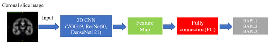 As mentioned in Section 2, we classified the BAPL score of PET images by a deep-learning-based 2D implementation in standard deep-learning-based methods. The useful high-level features were extracted from each coronal slice image by 2D CNNs [16]. The image was then classified as BAPL1, BAPL2, or BAPL3. The network structure is shown in Figure 2. As the backbone networks for feature extraction, we employed three state-of-the-art CNNs: VGG 19 [17], ResNet 50 [18], and DenseNet 121 [19]. The performances of the three networks is discussed in Section 4.
