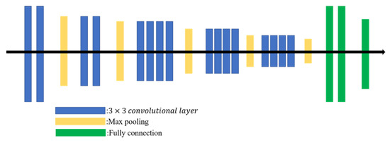 The Visual Geometry Group network (VGGNet), proposed in 2014 [17], combines multiple 3 × 3 convolutional filters into a large receptive field (the output size depends on the effective area of the input image). Multiple stacked smaller-sized filters achieve a deeper network than a single large filter, so more complex features can be learned at lower cost. The VGG19 is a VGGNet with 19 layers (16 convolutional layers follow three fully connected layers) as shown in Figure 3.