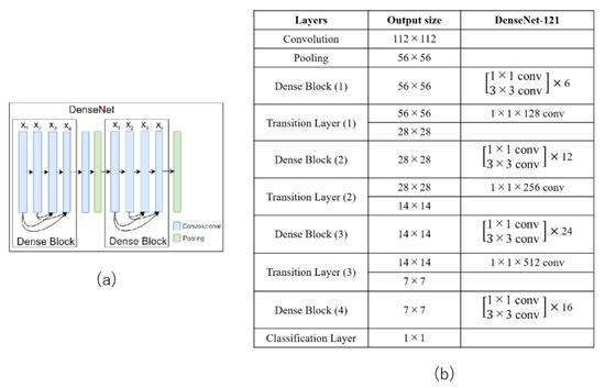 The densely connected network (DenseNet) architecture is an extension of ResNet which groups the convolution layers into a block of layers called a dense block [19]. DenseNet differs from other networks in its connectivity pattern. DenseNet is a stack of dense blocks, each consisting of multiple convolutional layers. It requires fewer parameters than ResNet. It also solves the information (and gradient) flow problem, because each layer can directly access the gradients from the loss function and the original input image [19]. Figure 5a shows a representative DenseNet with two dense blocks. The detailed architecture of DenseNet121 is shown in Figure 5b.