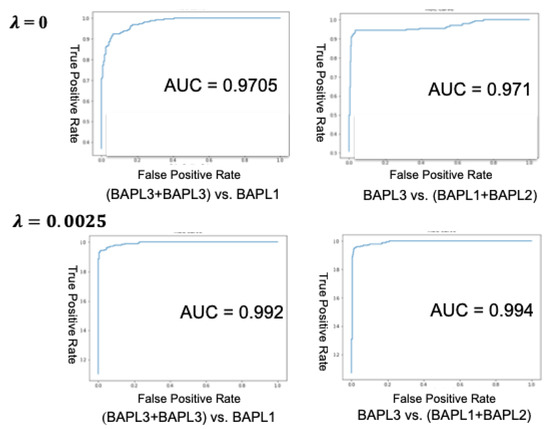 We also calculated the accuracy, receiver operating characteristic curve (ROC), and area under curve (AUC) in two-class classifications: BAPL3 + BAPL2 versus BAPL1 and BAPL3 versus BAPL1 + BAPL2. In the first case, both BAPL3 and BAPL2 were treated as positive, whereas in the second case, only BAPL3 was treated as positive. The ROC curves and AUCs of BAPL3 + BAPL2 versus BAPL1 and BAPL3 versus BAPL1 + BAPL2 are shown in Figure 6, and the two-class classification accuracies are given in Table 7. Both the AUCs and accuracies of cases 1 and 2 were significantly higher for the proposed joint loss function (λ = 0.0025) than for the conventional loss function (λ = 0.00).