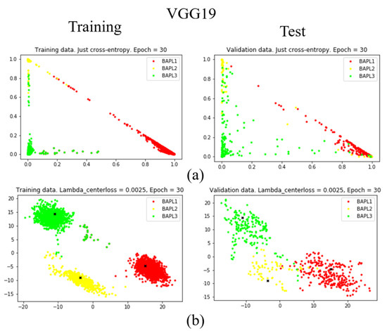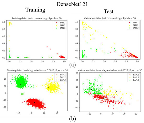 As shown in Figure 7a, Figure 8a, and Figure 9a, when we only used the conventional loss function, parts of the BAPL2 data (yellow) were mixed with BAPL3 (red) and BAPL1 (green) in the test samples. On the other hand, the BAPL2 samples (yellow) were separated from those of BAPL1 (red) and BAPL3 (green) by the use of the proposed joint loss function as shown in Figure 7b, Figure 8b, and Figure 9b. From these results, we can easily understand why the classification performance, especially for BAPL2, was significantly improved by the proposed joint loss function.