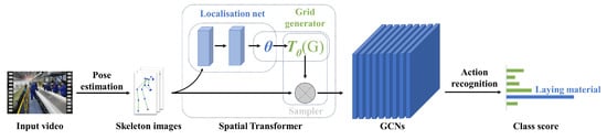 The coordinates of the joint in the skeleton image (including 2 spatial coordinates, 1 confidence parameter, and 1 temporal coordinate) and the connection relationship between the joints are used as input of the model we proposed. Then, the STN adaptively adjusts the human body pose by translating, rotating, and scaling the skeleton image to eliminate the influence of the human body pose diversity. Finally, the high-dimensional features in skeleton images are automatically extracted by the multi-layer GCNs, and the class score of action categories can be obtained, thereby realizing the recognition of the manual operation in the industrial workflows. The recognition process can be expressed as Algorithm 1.