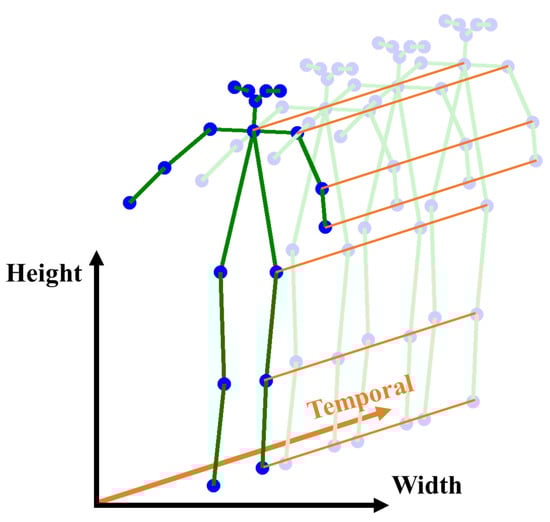 After the correction of STN, the skeleton images are adjusted to the appropriate size and pose, and the input video is also converted into a series of images at different positions on the time axis. As shown in Figure 3, each blue dot represents a keypoint on the human body, the green lines represent the human limbs and the torso, and the orange line represents the connection of the same keypoint in consecutive frames. Human skeleton images at different moments form an interconnected network in 3D space, called a spatial temporal skeletal graph, the three dimensions of which are the width direction and height direction of the image and the temporal dimension, so any keypoint can be represented as a space coordinate . w and d correspond to the position of the keypoint in the skeleton image, c represents the confidence of this keypoint, t corresponds to the moment corresponding to the keypoint. Therefore, the remaining question is how to extract the spatial and temporal information from these keypoints and the connections between them to recognize actions.