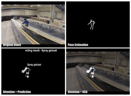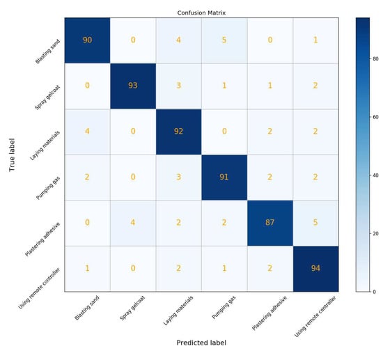 In this section, we evaluate the performance of the proposed method in real industrial workflows. We experimented with the proposed method in recognizing six basic manual operations, including blasting sand, spraying gelcoat, laying materials, pumping gas, plastering adhesive, and using a remote controller, all in the wind turbine blade manufacturing process. All video data is obtained using a normal RGB camera characterized by 1/2.7″ complementary metal oxide semiconductor (CMOS) sensor with 12 megapixels. The details of the dataset are shown in Section 4.1. The implementation details of the method we proposed are given in Section 4.2. The experimental results and comparisons with existing studies are given in detail in Section 4.3. In Section 4.4, we discuss the role of each module in the model and its impact on the experimental results.