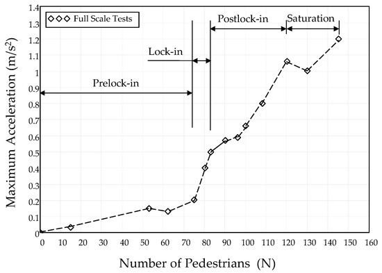 Laboratory tests that have been performed by several researchers provide evidence of the auto-induced forces. For example, the response spectrum measured by Dey et al. [16], or the load spectrum measured by Ricciardelli and Pizzimenti [11] or Ingólfsson and Georgakis [17]. In all these cases, the auto-induced harmonic (in the natural frequency of vibration) accompanies the harmonics of the pedestrian load. In addition, full-scale crowd pedestrian tests have been performed to verify the auto-induced effect and to determine the critical number of pedestrians needed to trigger it. Some examples are the tests conducted in structures such as the Pedro e Inês footbridge (Coimbra) [18], the Changi Mezzanine Bridge (Singapore Changi Airport) [19,20] or the Lardal footbridge (Norway) [21]. Figure 1 reproduces the experimental results of the full-scale pedestrian tests performed on the Pedro e Inês footbridge. The data points have been joined to show the acceleration trend. It can be observed that, as the number of pedestrians increases, the lateral dynamic response increases in four stages:
