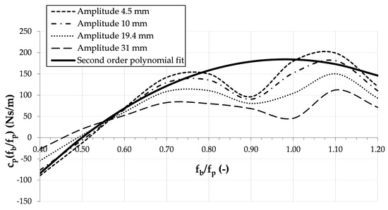 Figure 3 compares the value of the coefficient of proportionality cp obtained using the amplitude dependent stochastic model [17] at four different vibration amplitudes (4.5, 10, 19.4 and 31 mm), with the value obtained using Equation (4) [42]. It can be observed that the value of cp decreases as the amplitude increases, resulting in the second order polynomial (Equation (4)) being an upper bound of the experimental results.