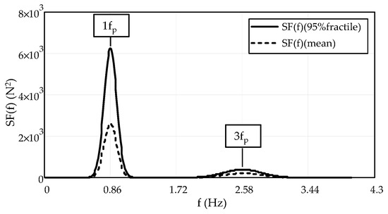 Furthermore, the dependence of the function S(f,fp) with the step frequency fp shows the inter-subject variability in the loads. As done before, using the probability distribution function of the step frequency P(fp) and applying the superposition principle, the contribution of each possible value of fp included in the interval (μ−3σ, μ+3σ) of the load exerted by one pedestrian is expressed through the function SF(f) (N2), which can be expressed independently from the step frequency, as follows:
