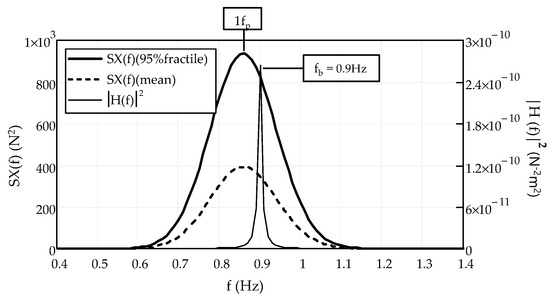 Equation (15) is represented in Figure 6 by overlapping the functions SX(f) and | H ( f ) | 2 in the case of the Pedro e Inês footbridge [18] with fb = 0.9 Hz, M = 165,880 kg, K = 5,304,000 Nm−1, C = 10,880 Nsm−1, L = 144 m and Ld = 88 m. It can be observed that the structural response is amplified only in a very narrow interval centred in fb. Additionally, in most of the cases (footbridges with a natural frequency in the range 0.4–1.3 Hz), the dynamic response is only caused by the PSD of the first harmonic of the load.