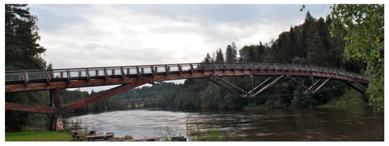 The Lardal footbridge (Figure 9) is located in Lardal (Norway), above the river Lagen. On the opening day in 2001, the phenomenon of lateral vibrations was observed at this bridge [21]. The bridge has a shallow arch of 91 m chord, made of glue-laminated timber with steel cable reinforcements in certain parts of the main span.