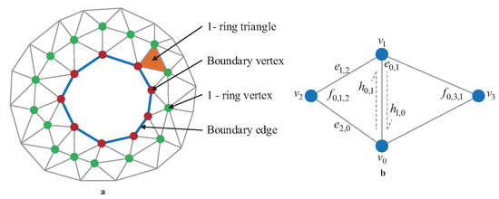 As shown in Figure 2a, a triangular mesh is composed of a set of vertices and triangles, in which a boundary edge is an edge that only has one adjacent triangle, and a boundary vertex is a vertex that is adjacent to a boundary edge. In addition, all triangles and vertices who share one common vertex are called 1-ring triangles and 1-ring vertices respectively. In order to make the notations appeared in this paper uniform, a group of symbols are defined: is a vertex, is an edge from to , is a triangle with vertices (, , ) in counterclockwise order and its normal is , is a halfedge from to , and is the normal at vertex . In this work, a halfedge data structure of triangular mesh is adopted for quick query, as shown in Figure 2b, in which two triangles , share a common edge , so we call them as the adjacent triangles of . Since the startpoint of the edge is the same as the endpoint of , is regared as the next edge of . Similarly, its previous edge is the edge . Furthermore, two vectors and are defined as the halfedges of . This data structure enables us to efficiently and rapidly access its topological elements for one selected vertex or edge. Assuming that all mesh models used in this paper are manifold, and especially there are no islands inside the detected holes.