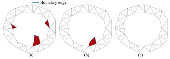 In most cases, the boundary of one hole suffers from a few tooth faces, each of which contains at least two boundary edges, as shown in Figure 3a. The purpose of applying boundary cleaning is to remove these tooth faces that will introduce illness in the subsequent hole-filling procedures especially regarding the advancing front hole-filling algorithm [18], and to make the boundary curve of the hole smoother. The main steps of the cleaning process are as follows: first, the 2-ring adjacent faces of the hole boundary detected by using the previously described method are searched. Second, it will be removed if one face has been checked as a tooth one by iterating over the collected faces, as shown in Figure 3a,b. Next, the vertex-face topology of the remaining faces within the 2-ring range needs to be updated. Finally, in the same way, other new tooth faces can be removed and our method terminates without any new tooth faces being detected. After the boundary cleaning, the boundary curves of all identified holes become cleaner and smoother, as shown in Figure 3c.