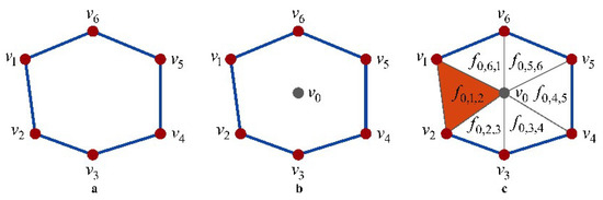 In the case of small-sized holes, since the number of hole boundary vertices is small and their boundary shapes are not complicated, the missing regions will not heavily affect the completeness of the whole mesh. Besides, fastly closing the small-sized holes can also make the filling patches assort with surrounding meshes well wherever they appear in flat or high curvature regions. Therefore, a fast and simple technique may be very reasonable for handling this type of holes instead of applying advanced hole-filling algorithms. In our work, a simple and fast algorithm named centroid-based method is utilized to fill small-sized holes, and the pseudocode is in the Algorithm 1. The hole-filling process is as follows: as shown in Figure 4a, there exists a closed loop including six boundary vertices , and the hole can be identified by using the method described in Section 4.2. Depending on these hole boundary vertices, their centroid vertex can be calculated, as shown in Figure 4b. For each pair of two continuous boundary vertices, they will be connected with to create a new triangle in counterclockwise order with oriented normal (see Figure 4c). By looping the rest of boundary vertices in the same way, the other five new triangles can be created. Therefore, the hole shown in Figure 4a is finally closed by inserting six newly created triangles.
