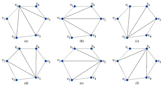 Initial triangulation The key idea of the minimum area triangulation is to create every single triangle by directly connecting three ones among all the hole boundary vertices. As shown in Figure 5, there is a hole with six boundary vertices (), and it is obvious that six filling schemes are available after looping all the boundary vertices. For each scheme, the total area of all filling triangles needs to be computed, and then these areas will be compared to find the smallest one. We assume that the scheme shown in Figure 5e has the smallest area, so the patching mesh of this scheme is finally chosen as the initial filling patch by using the minimum area triangulation. It can be seen that the filling efficiency of the minimum area triangulation is closely related to the size of the hole boundary vertices. This is the main reason why the minimum area triangulation is not suitable for filling large-sized holes.