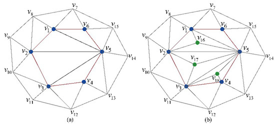 - Edge swapping. To maintain a Delaunay-like triangulation, edge swapping is necessary after the triangle splitting. The swapping process is: for the two triangles adjacent to one edge, each of the two-mutual vertices of these triangles is checked. Then, the edge needs to be swapped if the vertex lies outside of the circum-sphere of its opposing triangle. As shown in Figure 7b, since lies inside the circumcircle of the triangle adjacent to the edge , both and are swapped. After edge swapping, the triangles and become more regular.